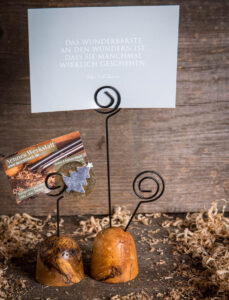 Ein Stück knorriger Ast wird zu einem Kartenhalter