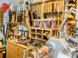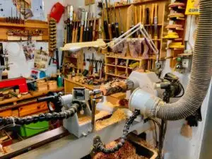 Hier in meiner Drechsel-Ecke unserer großen Werkstatt fühle ich mich am wohlsten. Wenn die Aussentemperaturen stimmen, kann ich durch die offene Tür sehen, wer mich besuchen kommt.