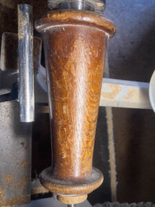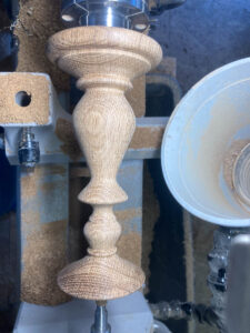 Das Tischbeinstück in die Drechselbank gespannt und loslegen…
