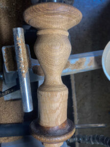 Das Tischbeinstück in die Drechselbank gespannt und loslegen…